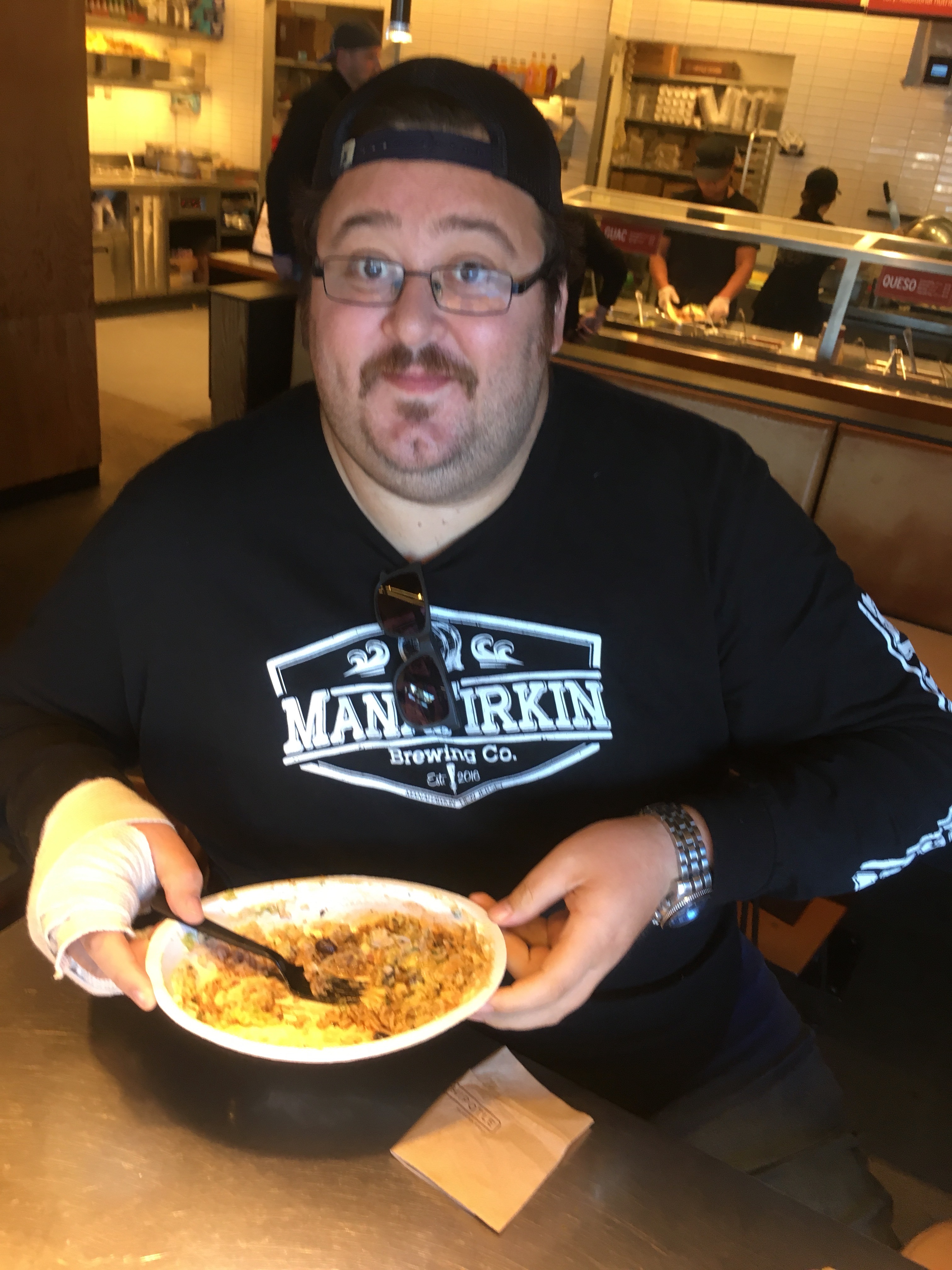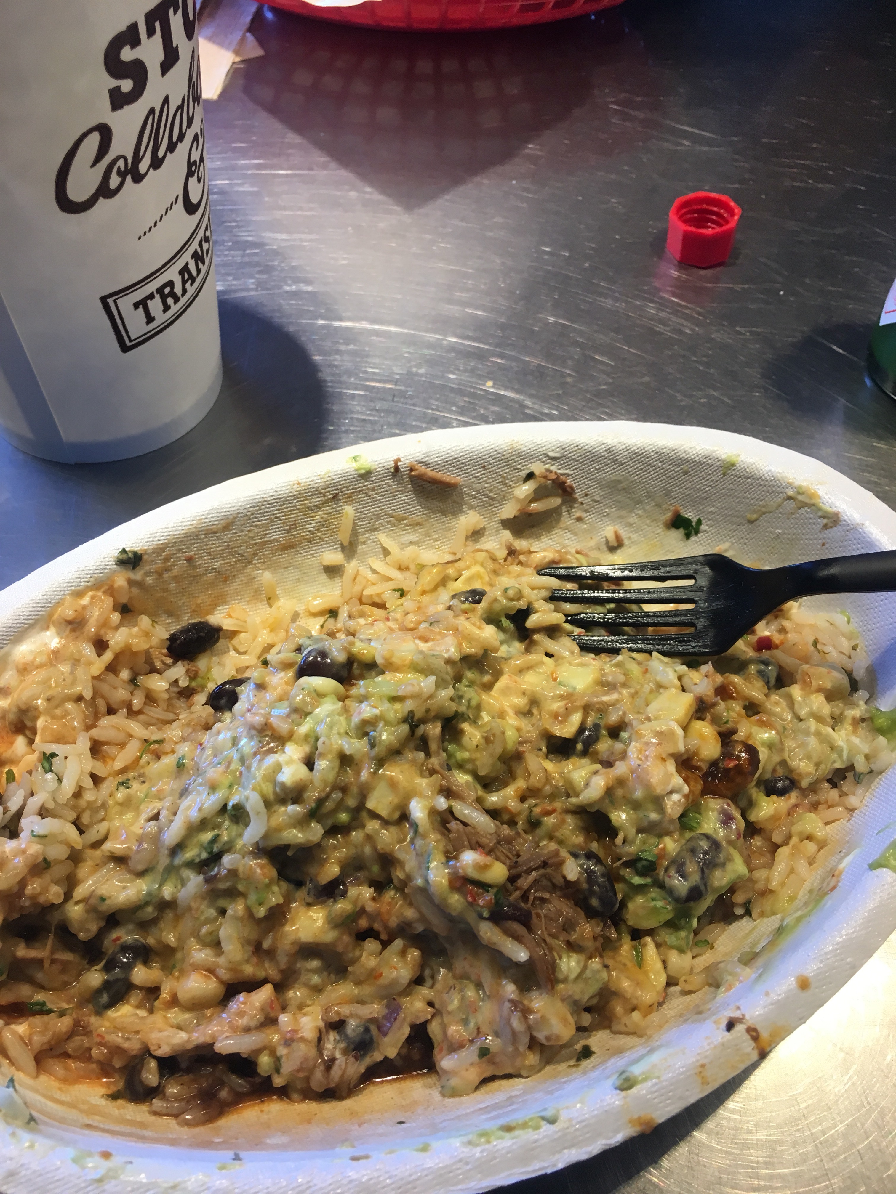 I decided to go with some slop bowl instead of a burrito. I went with beef, rice, corn salsa (which made an appearance later) hot sauce, guacamole, and sour cream. I forgot to get cheese because I’m an idiot. Also they didn’t ask me. Which is sort of on them. I told them I was a first timer and that was met with a blank stare. I was hoping they’d hold my hand, show me the ropes, you know- slide it in nice and easy. What I got was dry fucked by a cheese-less slop bowl. I should have taken a before picture, but this is what it looked like mid meal.