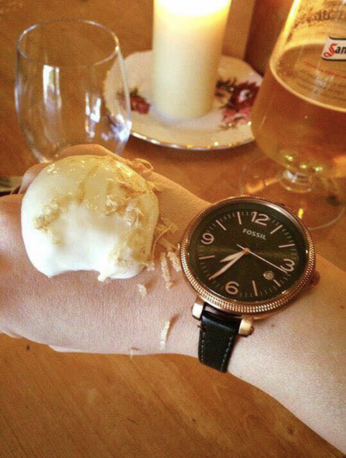 Now, let’s get to the repurposing of items that should not be used as plates. Like this perfectly good fish bowl drink glass.