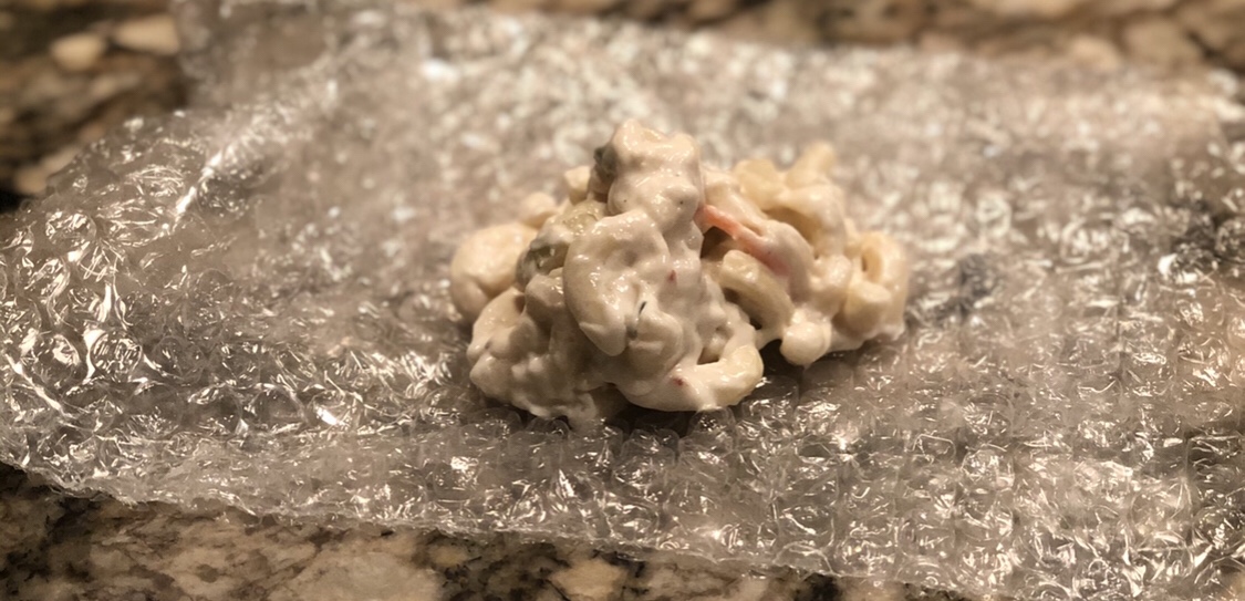 Here is some macaroni salad that was served on repurposed bubble wrap. What was the bubble wrap used for? Was it keeping your fat neighbors dildo from knocking itself out of the box? Maybe. All I know is there’s probably an unused bowl crying in a closet somewhere, upset that the packaging is getting all the shine.