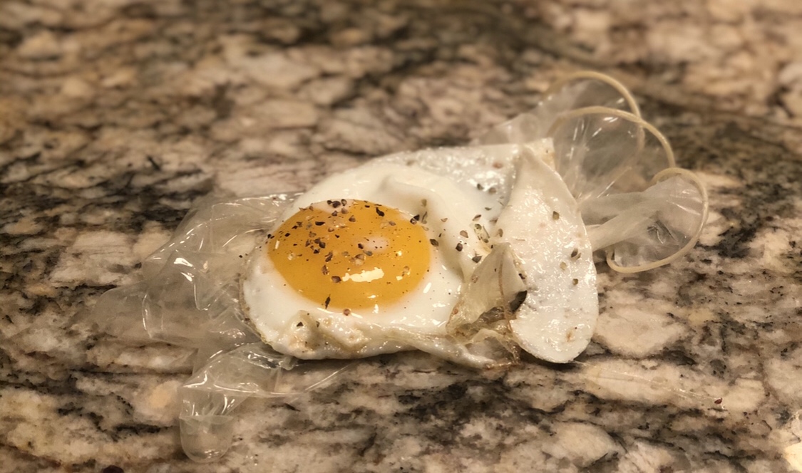 Here’s a perfect egg, seasoned and fried to perfection. Then, after all that hard work it was tossed on top of condoms used by the back of the house the night before. I mean come on, give me a break here guys.