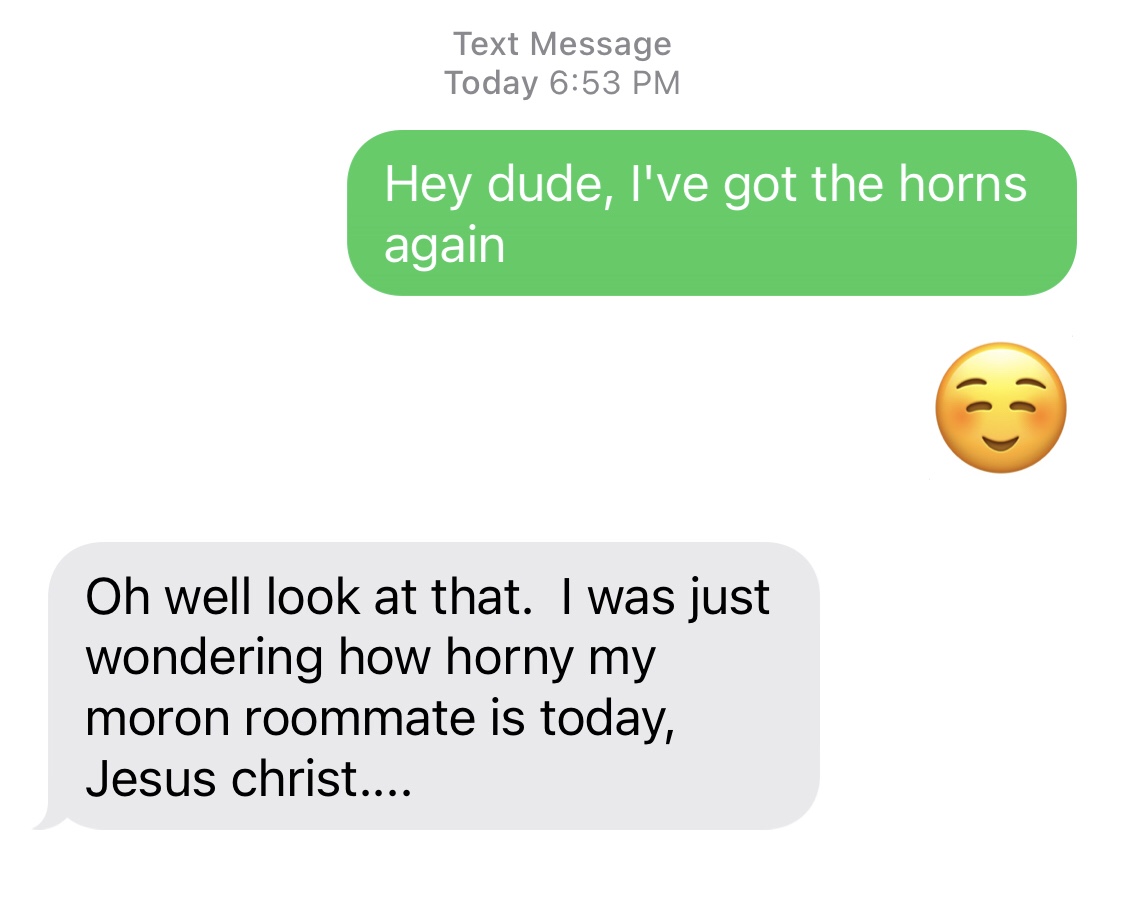 Either way having the horns is part of life. The sun and moon will take their turns in the sky. The rain and clouds will come and go. And you’ll remain horny on and off until that last bit of oxygen leaves your lungs. But remember, don’t be a horny fucking creep. It’s super unbecoming. Whenever you’re about to send an un-solicited and unprovoked horny message, ask yourself, “Would I love someone sending this to my sister/mom or brother/dad?” If the answers no, then throw your phone into your lagoon, just try not to hit your new boat.